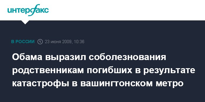 Москва. 23 июня. INTERFAX.RU - Президент США Барак Обама выразил соболезнования родственникам людей, погибших или пострадавших при столкновении поездов в вашингтонском метро.