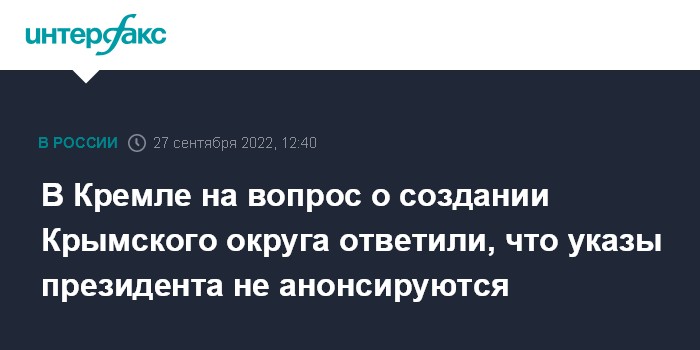 Москва. 27 сентября. INTERFAX.RU - Пресс-секретарь президента РФ Дмитрий Песков заявил, что если будут приняты какие-то решения, касающиеся создания нового федерального округа, Кремль об этом проинформирует СМИ.