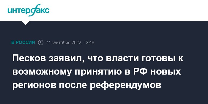 Москва. 27 сентября. INTERFAX.RU - Российская правовая система и исполнительная власть готовы к возможному вхождению в состав РФ новых субъектов после референдумов на соответствующих территориях, заявил пресс-секретарь президента РФ Дмитрий Песков.
