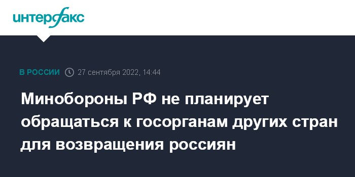 Москва. 27 сентября. INTERFAX.RU - Министерство обороны РФ не обращалось и не планирует обращаться в государственные органы Казахстана, Грузии и других стран по поводу принудительного возвращения россиян.