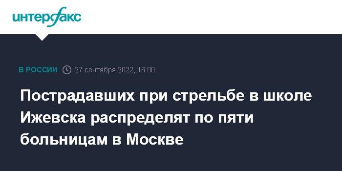 Москва. 27 сентября. INTERFAX.RU - Спецборт МЧС России во вторник доставил в Москву 15 пострадавших при стрельбе в школе Ижевска, большинство будут отправлены в Российскую детскую клиническую больницу, сообщила вице-премьер Удмуртии Эльвира Пинчук.