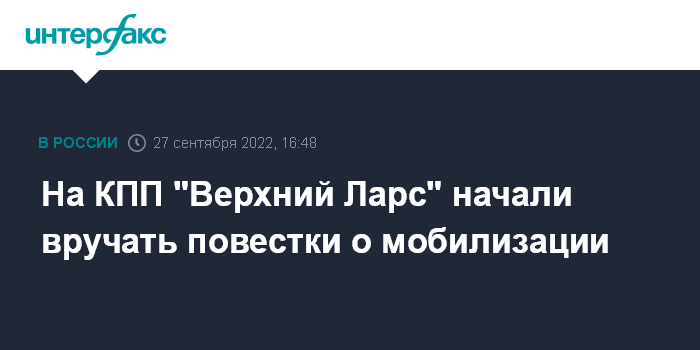 Москва. 27 сентября. INTERFAX.RU - На пункте пропуска "Верхний Ларс" через границу с Грузией начали вручать повестки о призыве по частичной мобилизации, сообщили "Интерфаксу" в пресс-службе главы и правительства Северной Осетии.