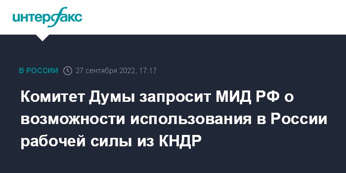 Москва. 27 сентября. INTERFAX.RU - Комитет Госдумы по международным делам обратится в МИД РФ по вопросу о возможном использовании рабочей силы из КНДР в России, заявила первый заместитель председателя комитета Светлана Журова.