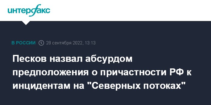 Москва. 28 сентября. INTERFAX.RU - Предположения о причастности России к инцидентам на "Северных потоках" глупы и абсурдны, заявил пресс-секретарь президента России Дмитрий Песков.