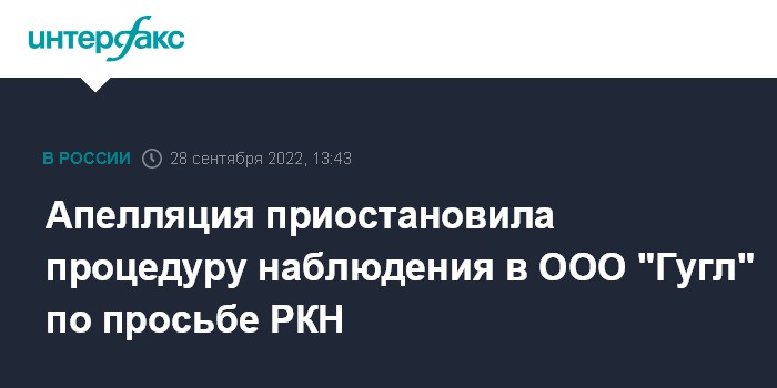 Апелляция приостановила процедуру наблюдения в ООО "Гугл" по просьбе РКН