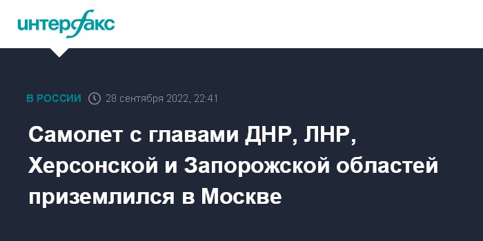 Москва. 28 сентября. INTERFAX.RU - Главы Херсонской и Запорожской областей, а также Донецкой и Луганской народных республик прибыли в Москву в среду вечером, сообщил заместитель главы херсонской военно-гражданской администрации (ВГА) Кирилл Стремоусов.