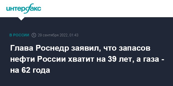 "По состоянию на 1 января этого года технологически извлекаемых запасов нефти у нас на 39 лет. Это то, что с использованием сегодняшних технологий мы можем добыть. Рентабельно извлекаемых запасов - на 33 года. Это то, что прямо сейчас можно продать при уровнях цен конца 2021 года. (...) Обеспеченность технологически извлекаемыми запасами природного газа - 62 года", - уточнил глава Роснедр.