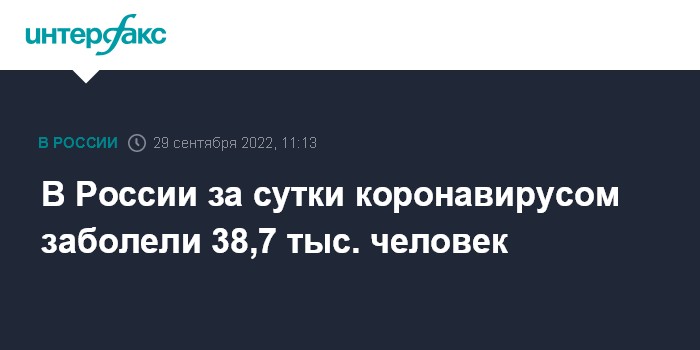 Москва. 29 сентября. INTERFAX.RU - Суточный прирост новых заболевших коронавирусом в России составил более 38,7 тысячи случаев, скончались 109 пациентов с COVID-19, следует из данных оперативного штаба, обнародованных в четверг.