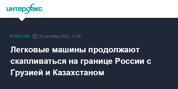 Москва. 29 сентября. INTERFAX.RU - Многокилометровые очереди из легковых автомобилей сохраняются перед КПП "Караузек" в Астраханской области на границе с Казахстаном и перед КПП "Верхний Ларс" в Северной Осетии на границе с Грузией.