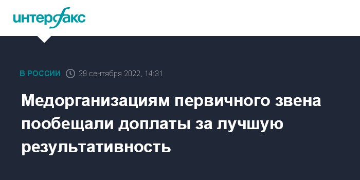 Москва. 29 сентября. INTERFAX.RU - Организации, оказывающие первичную медико-санитарную помощь, с 2023 года будут получать дополнительные деньги за лучшую результативность работы, сообщила директор департамента мониторинга, анализа и стратегического развития здравоохранения Минздрава Евгения Котова.