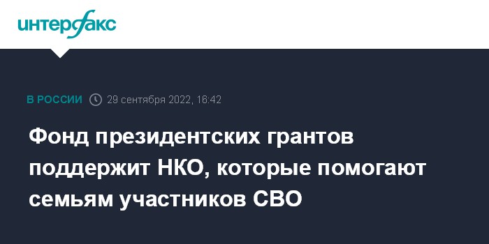 Москва. 29 сентября. INTERFAX.RU - Фонд президентских грантов создаст направление, в рамках которого предусмотрена поддержка некоммерческим организациям, оказывающим помощь семьям участников специальной военной операции, сообщил первый замглавы администрации президента РФ Сергей Кириенко.