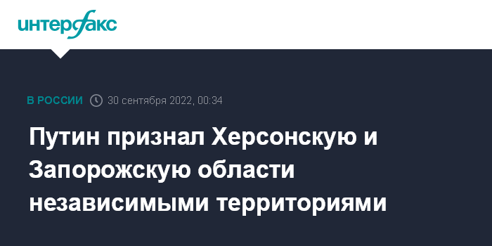 Москва. 30 сентября. INTERFAX.RU - Россия признала независимость Херсонской и Запорожской областей, следует из указов президента России Владимира Путина, опубликованных в пятницу на официальном портале правовой информации.