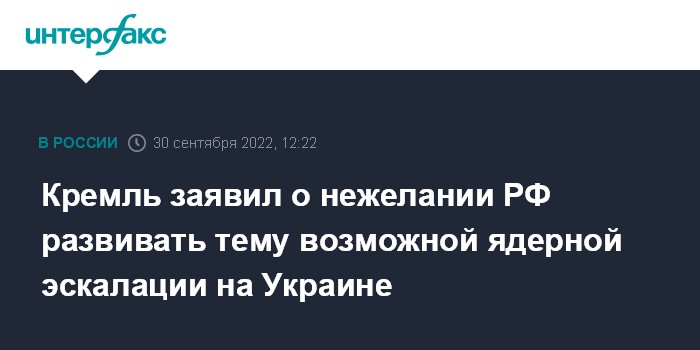 Москва. 30 сентября. INTERFAX.RU - Москва не хочет развивать тему возможной ядерной эскалации на Украине, призывает всех к ответственному подходу в этом вопросе, заявил журналистам пресс-секретарь президента РФ Дмитрий Песков.