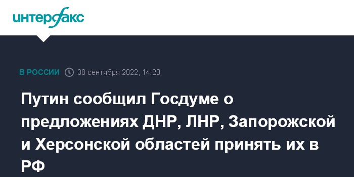 Москва. 30 сентября. INTERFAX.RU - Спикер Госдумы Вячеслав Володин сообщил, что президент Владимир Путин уведомил депутатов о предложениях ДНР, ЛНР, Запорожской и Херсонской областей принять их в состав России в качестве новых субъектов, сообщает телеграм-канал Думы.