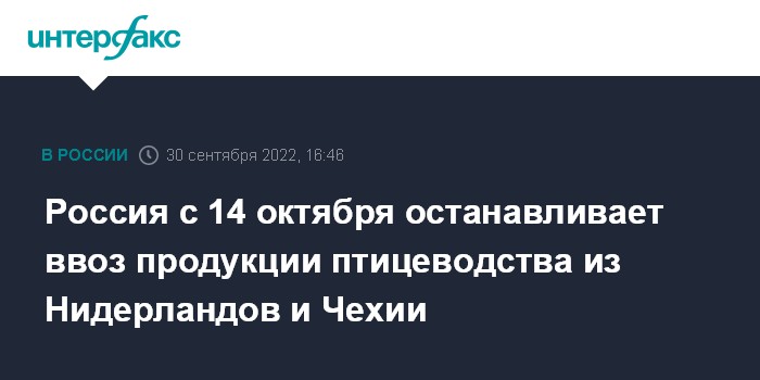 "Обеспокоенный таким положением дел Россельхознадзор запросил материалы, подтверждающие эффективность системы ветеринарного контроля за распространением болезни, у компетентных органов ряда стран ЕС со сроком предоставления до конца сентября 2022 года. В связи с отсутствием ответов от ветеринарных служб Нидерландов и Чехии, а также гарантий обеспечения безопасности поставок птицеводческой продукции, Россельхознадзор с 14 октября 2022 года вынужден приостановить ввоз из этих стран на территорию России инкубационных яиц и других птицеводческих товаров", - говорится в сообщении.