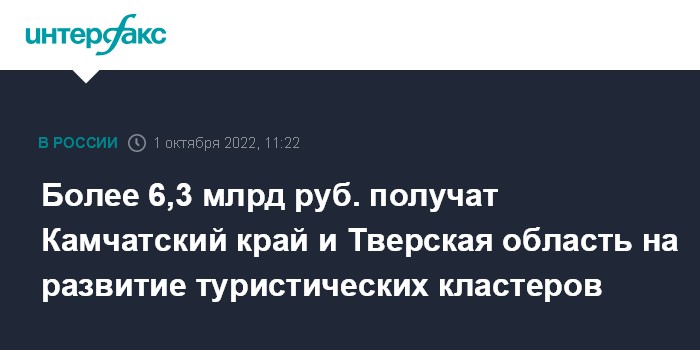 Москва. 1 октября. INTERFAX.RU - Премьер-министр России Михаил Мишустин подписал распоряжение о направлении более 6,3 млрд рублей в Камчатский край и Тверскую область для создания дорожной инфраструктуры и развития туристических кластеров 2022-2024 годов, сообщает сайт правительства РФ.