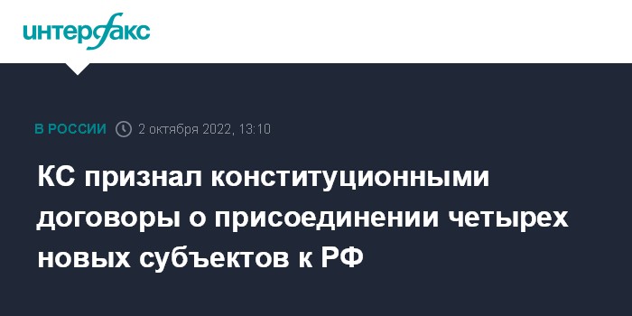 Москва. 2 октября. INTERFAX.RU - Конституционный суд РФ признал соответствующими Основному закону международные договоры о принятии в состав России Донецкой и Луганской народных республик, Херсонской и Запорожской областей.