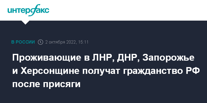 Москва. 2 октября. INTERFAX.RU - Проживающие в ДНР, ЛНР, в Запорожской и Херсонской областях приобретут гражданство РФ после принесения присяги гражданина РФ, сообщил председатель комитета Госдумы по госстроительству и законодательству Павел Крашенинников.