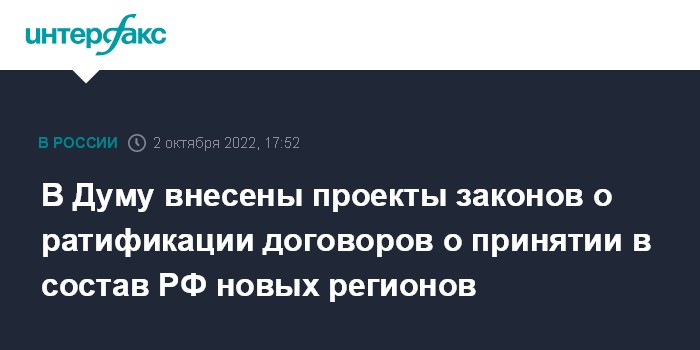 Москва. 2 октября. INTERFAX.RU - Проекты законов о ратификации договоров о принятии в состав России четырех новых субъектов внесены в Госдуму.