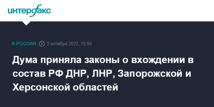 Москва. 3 октября. INTERFAX.RU - Госдума в понедельник приняла законы о вхождении в состав России Донецкой и Луганской народных республик, Запорожской и Херсонской областей.