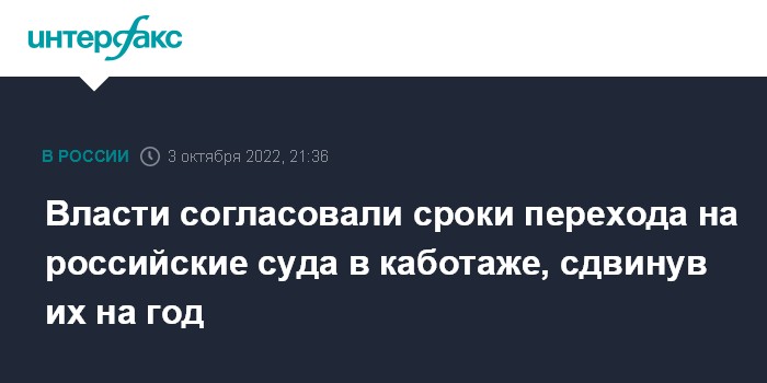 Москва. 3 октября. INTERFAX.RU - Власти согласовали сроки перехода на суда отечественного производства для использования в каботажных перевозках. Для малотоннажных судов требование вступит в силу после марта 2024 года, а для крупнотоннажных - после марта 2026 года.
