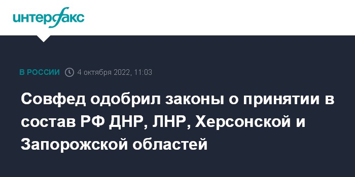 Москва. 4 октября. INTERFAX.RU - Совет Федерации на заседании во вторник проголосовал за законы о вхождении в состав России Донецкой и Луганской народных республик, Запорожской и Херсонской областей.