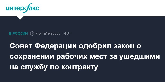 Москва. 4 октября. INTERFAX.RU - Совет Федерации одобрил за закон о сохранении рабочих мест за гражданскими служащими, направленными на военную службу по контракту.