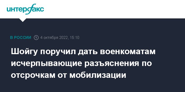 Москва. 4 октября. INTERFAX.RU - Министр оборону РФ Сергей Шойгу поручил российскому Генштабу довести до военкоматов и призывных комиссий исчерпывающие разъяснения по порядку предоставления отсрочек.