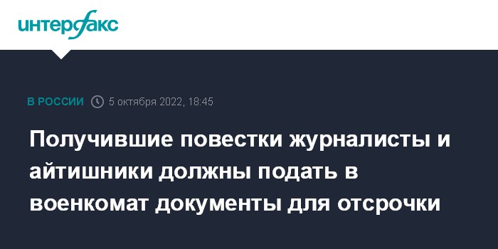 Москва. 5 октября. INTERFAX.RU - Сотрудники аккредитованных IT-компаний, системообразующих СМИ или операторов связи, которые соответствуют требованиям отсрочки от частичной мобилизации, если получат повестку о мобилизации, то должны прийти в военкомат и представить документы о праве на отсрочку, сообщили на портале "Объясняем.рф".