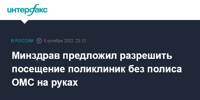 Москва. 5 октября. INTERFAX.RU - Минздрав России предлагает предусмотреть возможность для пациентов не носить с собой полис обязательного медицинского страхования (ОМС) для посещения поликлиники или больницы, достаточно знать его номер, сообщила пресс-служба министерства в среду.