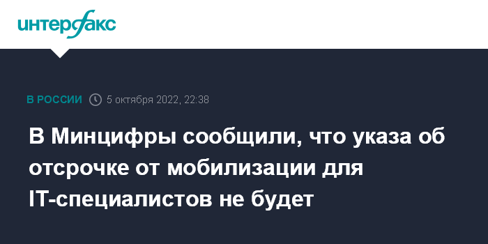 В Минцифры сообщили, что указа об отсрочке от мобилизации для IT-специалистов не будет