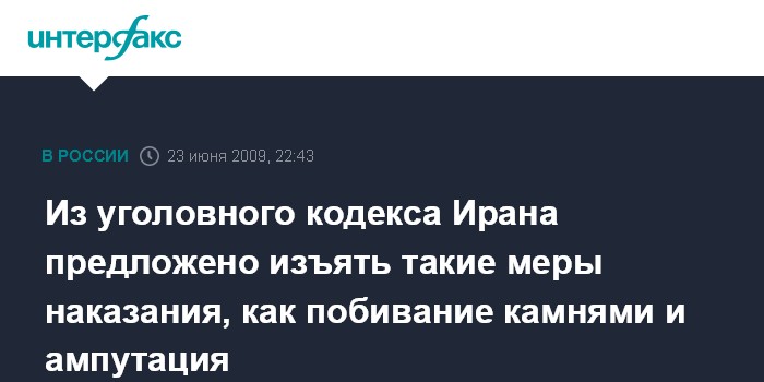 Тегеран. 23 июня. ИНТЕРФАКС - Комиссия по юстиции меджлиса (парламента) Исламской республики Иран выступила с предложением исключить из уголовного кодекса страны такие меры наказания, как побивание камнями и ампутация, пишет во вторник иранская пресса.