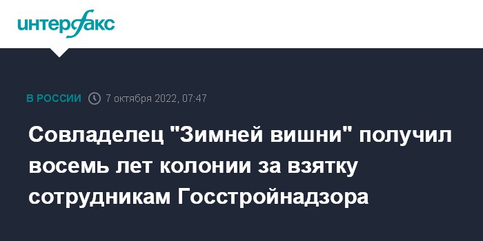 Совладелец "Зимней вишни" получил восемь лет колонии за взятку сотрудникам Госстройнадзора
