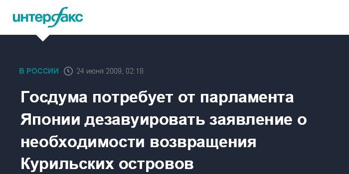Москва. 24 июня. ИНТЕРФАКС - Госдума в среду рассмотрит проект заявления, в котором потребует дезавуировать заявление японского парламента, касающееся признания им Курильских островов "исконно японскими землями".