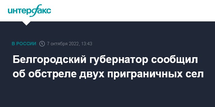 Москва. 7 октября. INTERFAX.RU - Губернатор Белгородской области Вячеслав Гладков сообщил об обстреле двух приграничных сел.