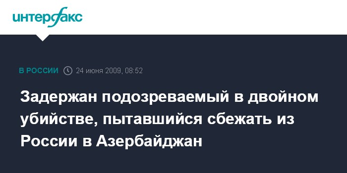 Москва. 24 июня. INTERFAX.RU - Во время перехода границы России и Азербайджана задержан уроженец Баку, подозреваемый в двойном убийстве и разбое.