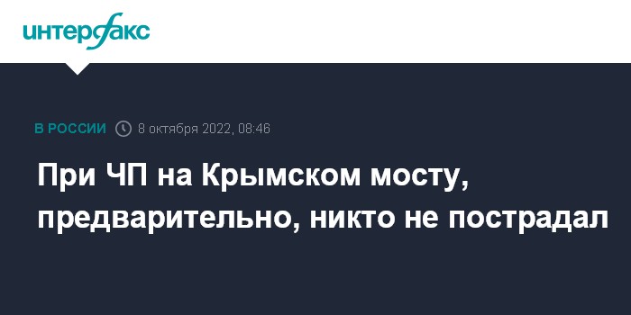 Москва. 8 октября. INTERFAX.RU - Пострадавших на Крымском мосту, где произошло возгорание топливной цистерны, предварительно, нет, сообщил журналистам советник главы Крыма Олег Крючков.