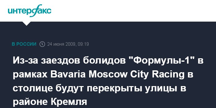 Москва. 24 июня. INTERFAX.RU - В рамках Bavaria Moscow City Racing в столице 19 июля пройдут заезды болидов "Формулы-1", сообщили "Интерфаксу" в городской администрации в среду.