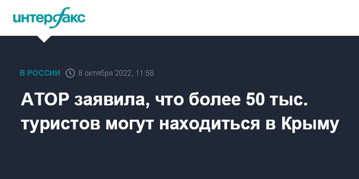 Москва. 8 октября. INTERFAX.RU - Более пятидесяти тысяч россиян в настоящее время могут проводить свой отдых в Крыму, сообщает в субботу Ассоциация туроператоров России (АТОР).