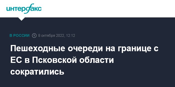 Москва. 8 октября. INTERFAX.RU - Пешеходные очереди в пунктах пропуска через границу в Псковской области сократились до нескольких десятков человек, заявил губернатор Михаил Ведерников.