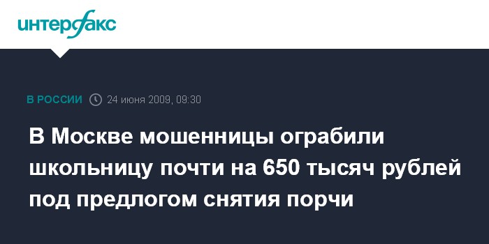 Москва. 24 июня. INTERFAX.RU - Более 640 тыс. рублей похитили у школьницы две женщины под предлогом снятия порчи в Москве, сообщил в среду "Интерфаксу" источник в правоохранительных органах.