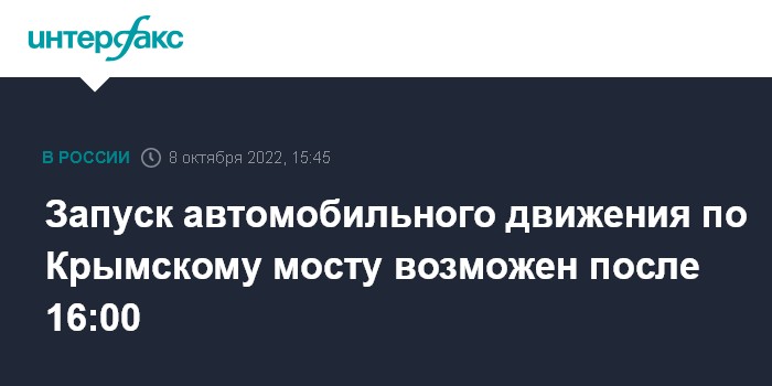 Москва. 8 октября. INTERFAX.RU - Запуск автомобильного движения по Крымскому мосту возможен после 16:00 по одной полосе в реверсивном режиме, сообщили в пресс-службе Минтранса РФ со ссылкой на главу ведомства Виталия Савельева.