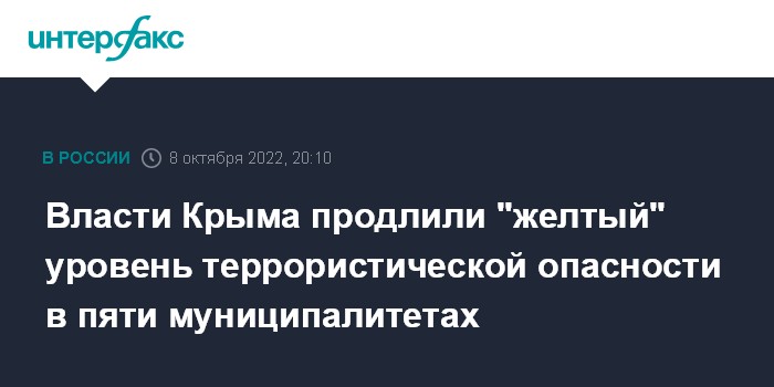 Москва. 8 октября. INTERFAX.RU - "Желтый" уровень террористической опасности продлен в пяти муниципалитетах на севере Крыма до 23 октября, сообщил глава республики Сергей Аксенов.