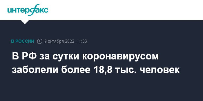 Москва. 9 октября. INTERFAX.RU - Суточный прирост новых заболевших коронавирусной инфекцией в России составил 18 819 случаев, следует из данных оперативного штаба, обнародованных в воскресенье.