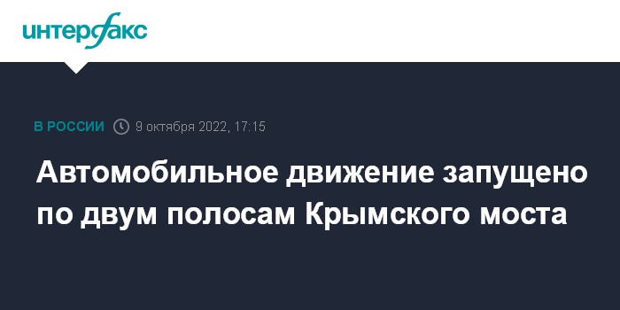 Москва. 9 октября. INTERFAX.RU - Автомобильное движение запущено по двум полосам Крымского моста, сообщил в воскресенье вице-премьер РФ Марат Хуснуллин в своем телеграм-канале.
