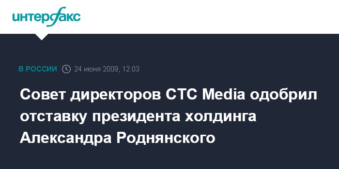 Москва. 24 июня. INTERFAX.RU - Совет директоров CTC Media одобрил отставку президента холдинга Александра Роднянского, говорится в сообщении СТС.