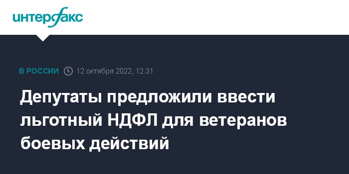 Москва. 12 октября. INTERFAX.RU - Ветеранов боевых действия в РФ предлагается освободить от НДФЛ при доходе до 417 тыс. рублей в месяц, при доходе свыше этой суммы НДФЛ предлагается сделать льготным - 50% ставки (сейчас основная ставка составляет 13%), следует из законопроекта, внесенного в Госдуму.