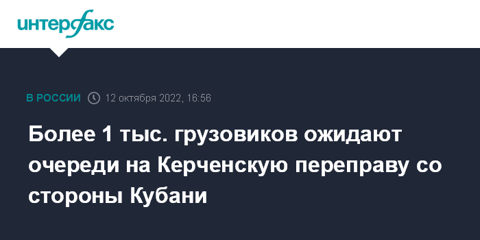 Москва. 12 октября. INTERFAX.RU - На стоянках в Краснодарском крае ждут перевозки через Керченскую переправу свыше тысячи грузовых автомобилей, сообщает пресс-служба администрации региона в среду.
