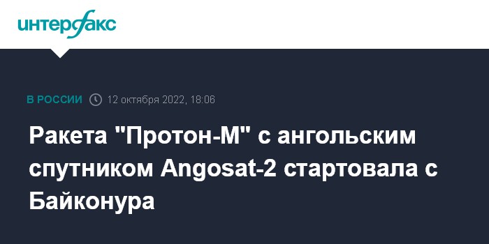 Москва. 12 октября. INTERFAX.RU - Ракета-носитель "Протон-М" с ангольским телекоммуникационным спутником Angosat-2 стартовала с космодрома Байконур, трансляцию запуска ведет "Роскосмос".
