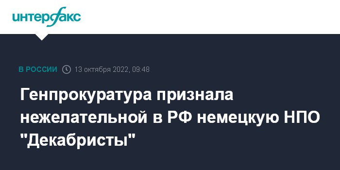"По результатам изучения поступивших материалов в Генеральной прокуратуре Российской Федерации принято решение о признании нежелательной на территории Российской Федерации деятельности иностранной неправительственной организации Dekabristen e.V. ("Декабристы") (Германия), угрожающей конституционному строю и безопасности России", - сообщили в Генпрокуратуре в четверг.